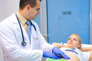 The doctor may also feel for distension, and possible changes in other internal organs such as the liver and spleen, and listen to the bowel sounds.